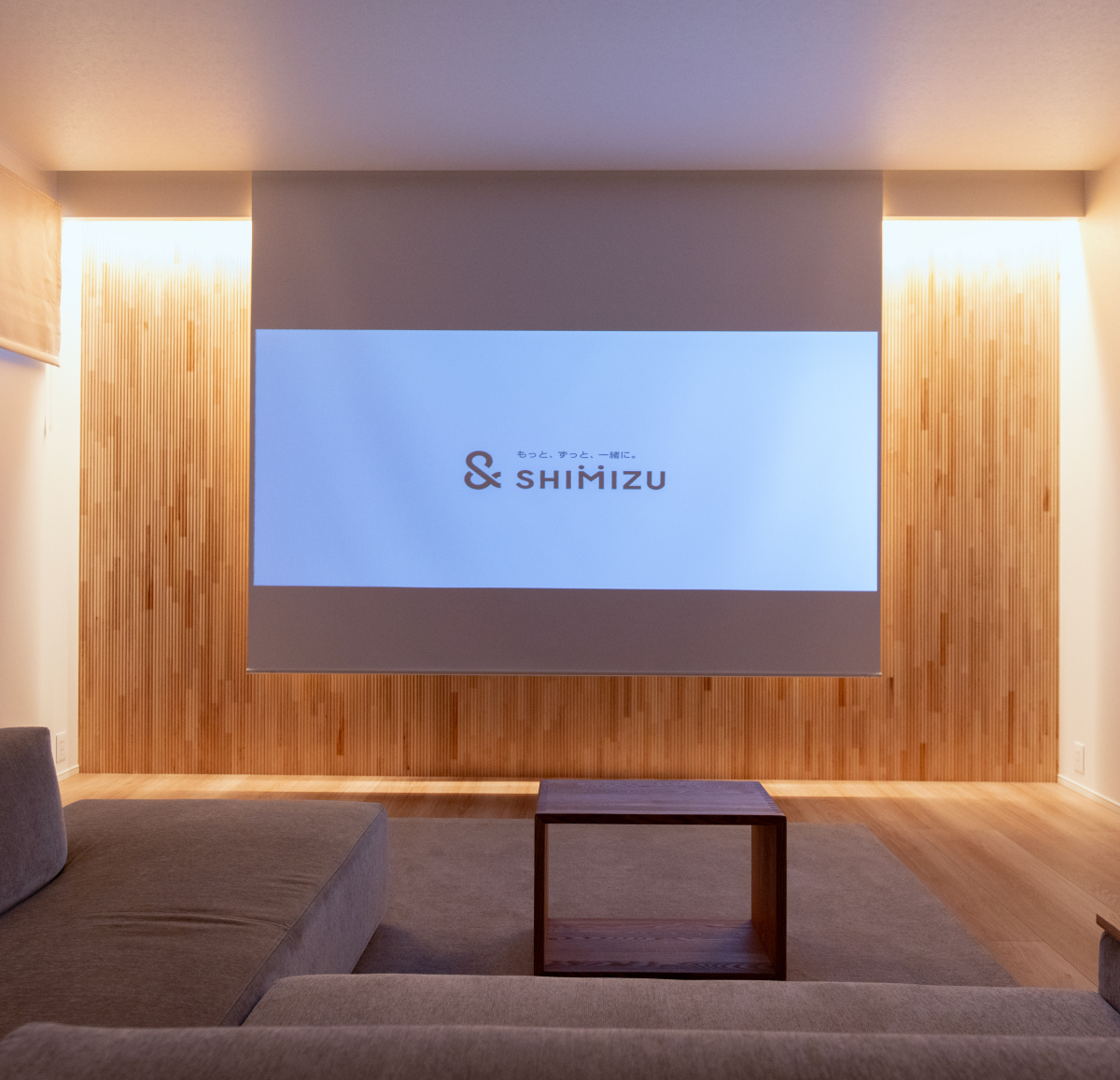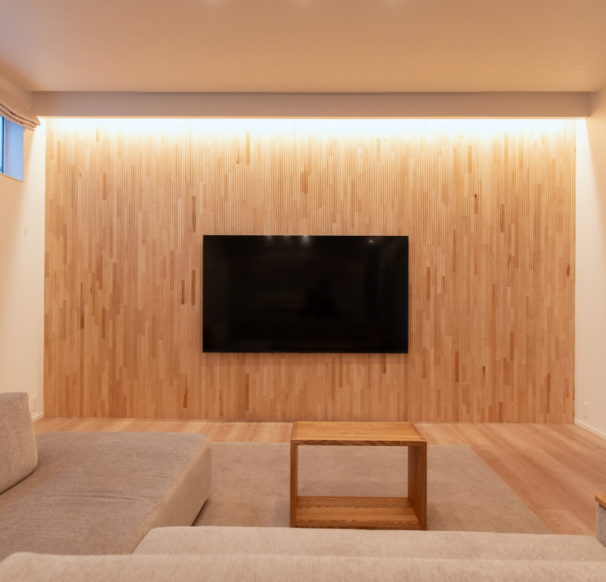 テレビ背面の壁一面に、メイプル無垢材を採用しました。